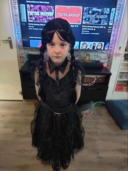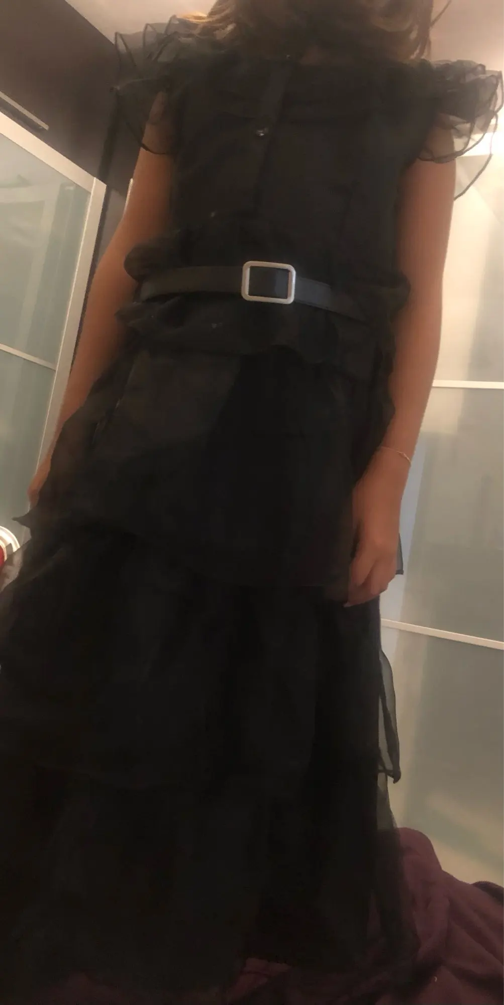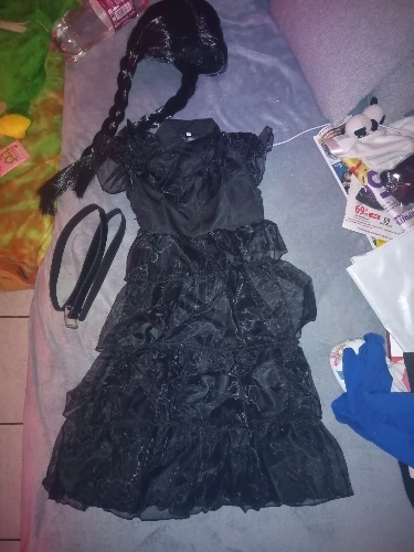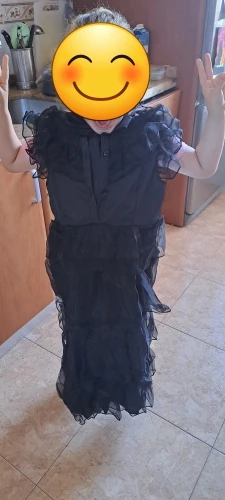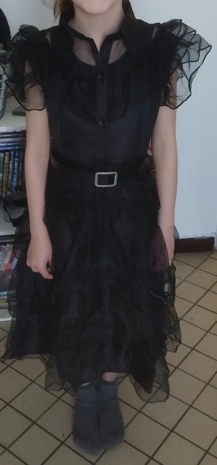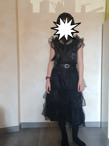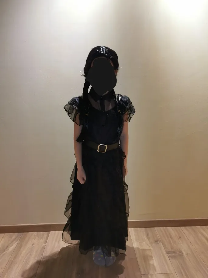 Dress in accordance with the photo. My Gilla measures 1m43 I took it in cm and it suits her a big but frankly, it’s perfect, she will be comfortable for the carnival. The dress is fine, the socks made of thick sticky material too, the belt is correct even if very simple. Very fast sending, received 3D in advance.